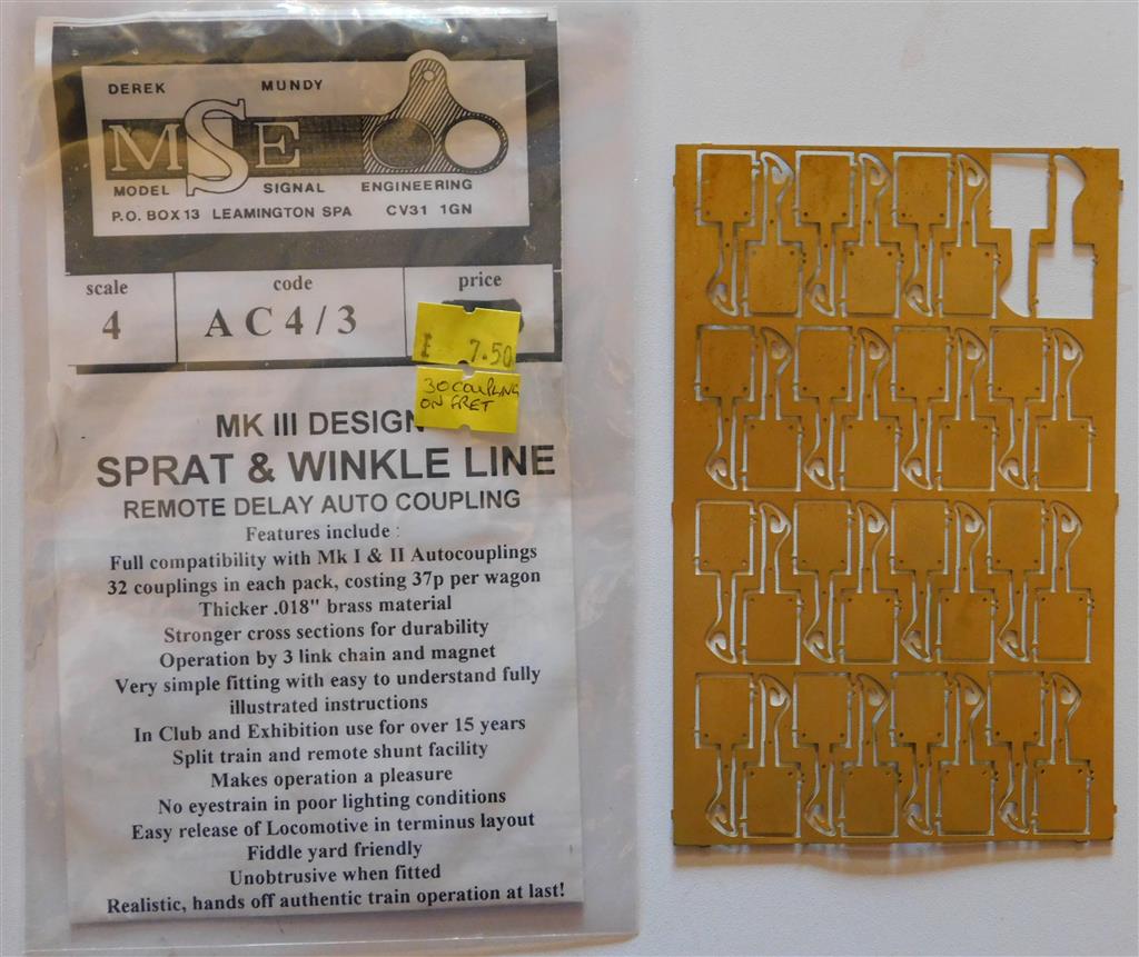 Opened packet containing fret of 30 Mk3 delayed operation autocouplings for 00 Gauge. Item number 1008.