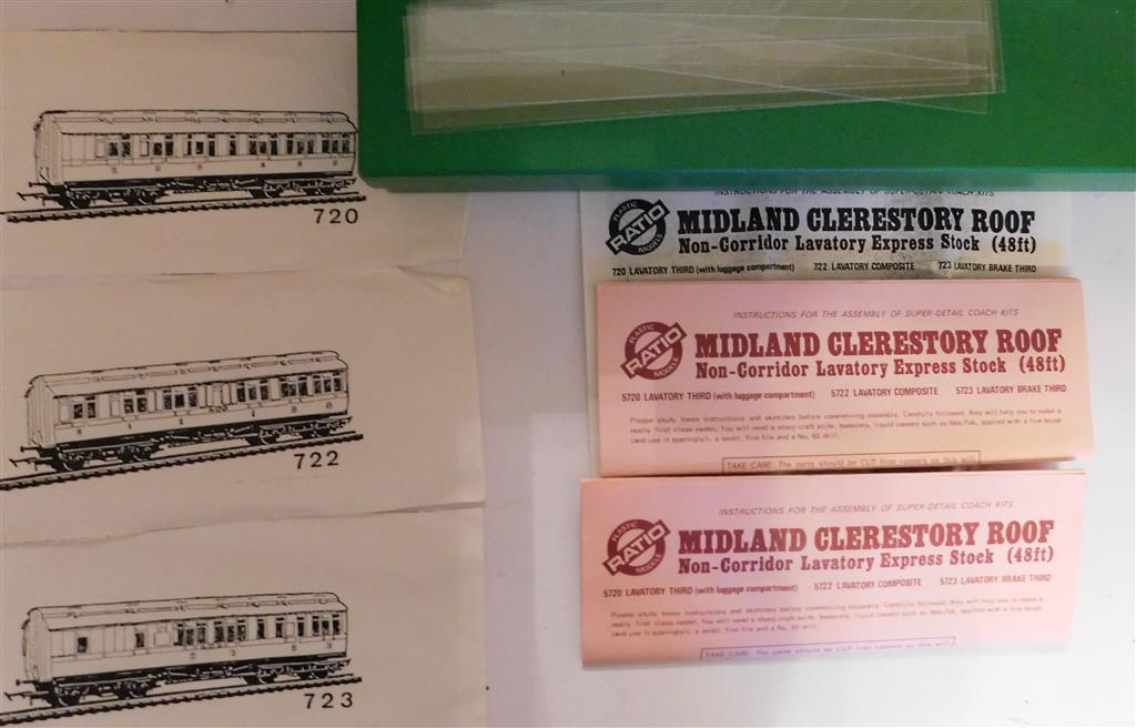 Kits - Coaches Ratio: Ratio LMS (Ex MR) set of six Express Clerestory coach kits, one x 720 All Third & Luggage, two x 722 Composite, three x 723 Brake Third. Complete kits.